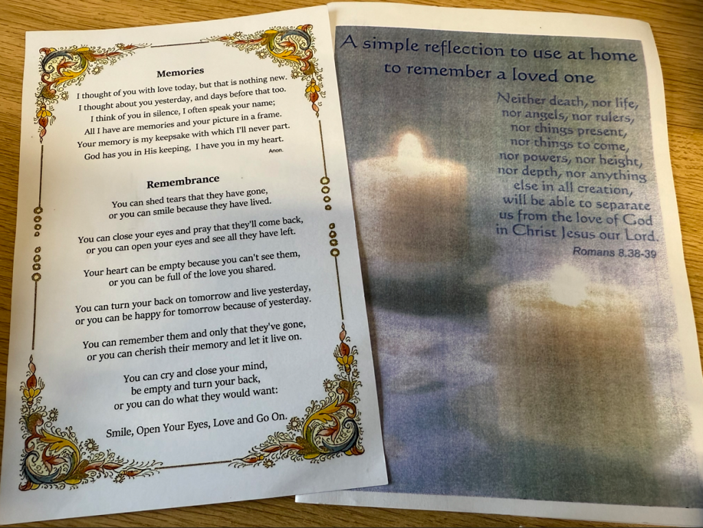 At the back of the church, there is also a leaflet with a short reflection that people can use at home to remember a loved one perhaps on an anniversary, with readings, thoughts and a prayer. There are cards with poems and readings that can be picked up too.