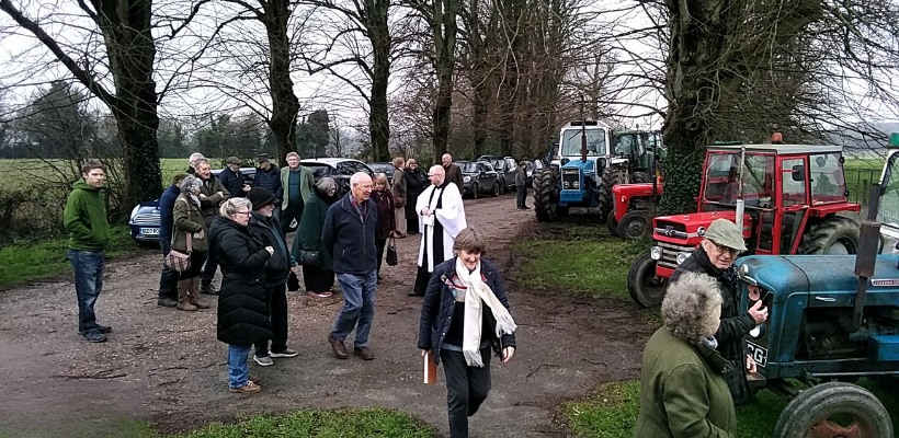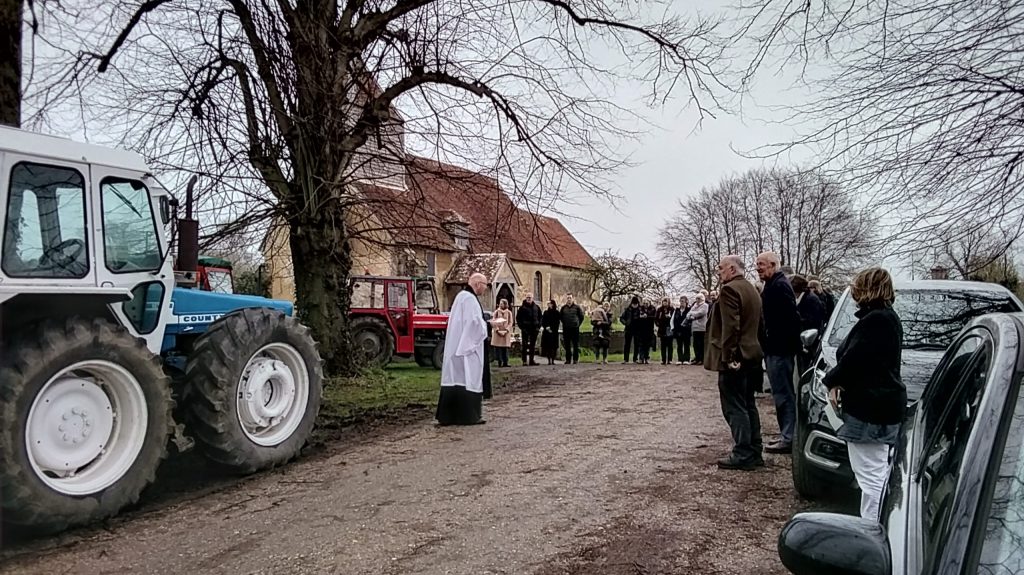 Paul Fielder, who has ploughed most of the fields around the church, spoke about the development of the plough from the earliest wooden tools to the huge machines used today and how they are all based on the same principles. After the service, the congregation gathered outside for the blessing of the tractors.