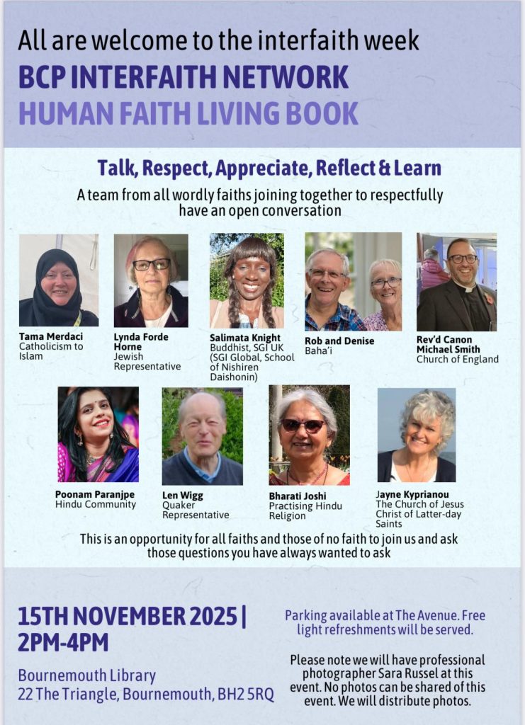The group was convened by Linda Ford-Horne who is a Jewish retired teacher who chairs SACRE, the RE advisory group for the area. Through her contacts and networks she brought together Revd James, who is Pioneer Minister at the Parish of Four Saints, along with David Warden, Chair of Dorset Humanists, Sister Tama Merdaci who is a Muslim who also runs the local aid charity ‘BCP Shout Out’, and Salimata Knight, Buddhist and member of SGI-UK. The group are also supported DEED which is an educational charity which supports teachers and pupils in learning about global issues and  cultural diversity.