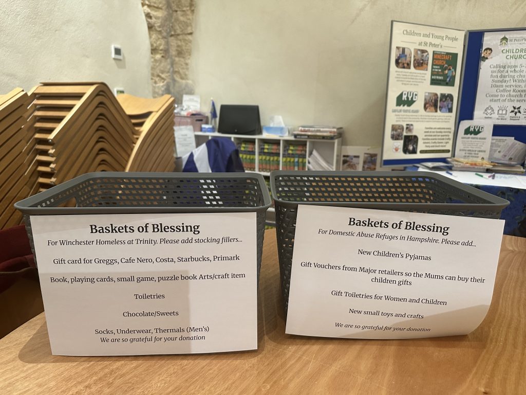 Baskets of Blessing have been situated at St Peter’s in Ropley this year for two organisations that support those in need at Christmas and throughout the year.