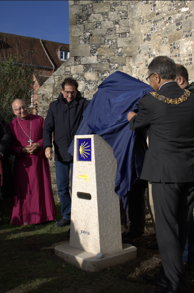 The installation was marked by a visit from a delegation from the Galician Government and the Provincial Council of A Coruna in Spain, who gifted the marker to Winchester. The Mayor of Winchester, Councillor Sudhaker Achwal also attended, along with members of the congregation, walkers, representatives from the city council and the Confraternity of St James which supports pilgrims during their journey.